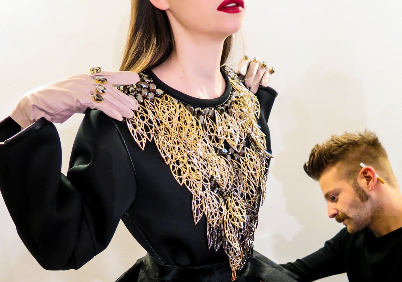 When Milan-based fashion designers Mia Vilardo and Riccardo Polidoro of Miryaki saw Formlabs' 3D printer on the desk of their friend Luke Hornung of TheSignStudio, they were inspired to design 3D printed, gold-plated leaves and weave them throughout their Fall/Winter 2014-15 collection.