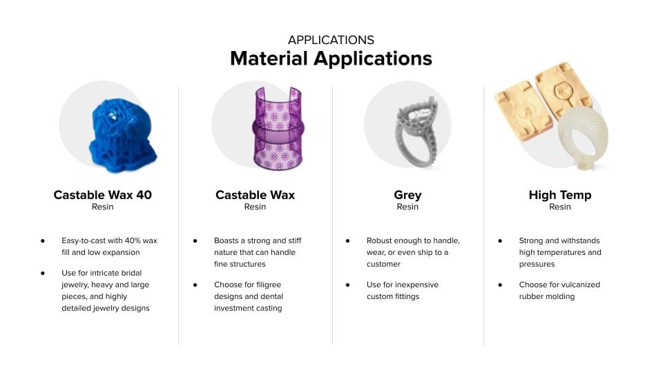 Castable Wax 40 Resin is easy to cast, accommodates a wide range of designs, and is supported by a complete 3D printing ecosystem. It is designed to fit seamlessly into the digital 3D printing workflow, which enables you to easily create and iterate on designs and preserve them. Bring your boldest jewelry designs to life with Castable Wax 40 Resin.