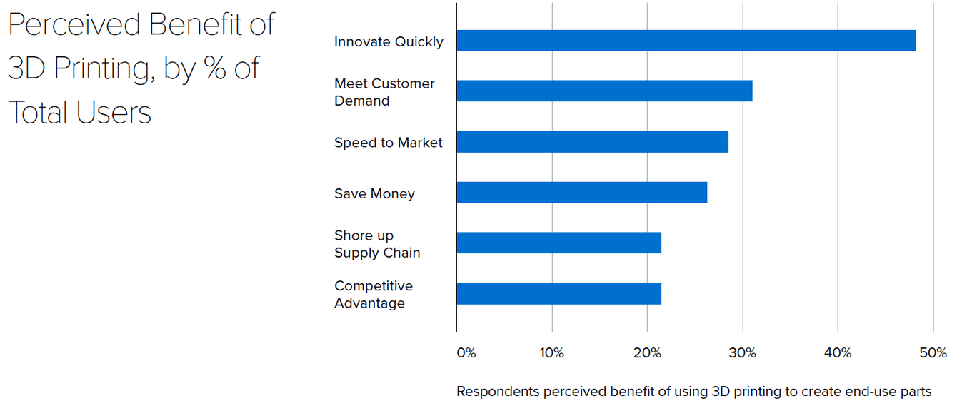 The 2022 3D Printing Applications Report is packed full of information on the current state of the 3D printing industry. It covers changes in perceived benefits (such as addressing supply chain shocks) of 3D printing, to adoption of new applications, and more.