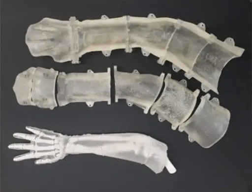 Photograph showing an unskinned phantom arm (bottom) beside its multi-piece casting mold (top) printed from a FormLabs’ SLA resin.