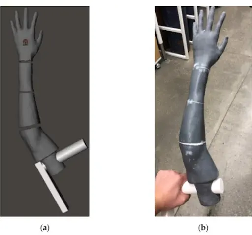 (a) phantom arm geometry (gray), with grip (white), in Meshmixer. (b) Skin covering overmold printed in parts with a Formlabs resin.