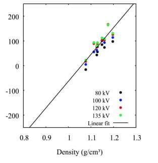 This figure represents the relationship between sample SLA materials density and CT number (HU). Higher material density is associated with higher CT numbers.