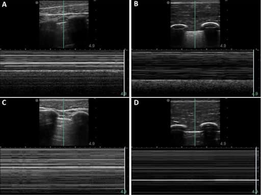 When the M-mode line was centered in the pleural lining, the baseline porcine subject provided the typical “sea-shore” sign (A). The post-injury porcine M-mode image lost this appearance and instead presented a “stratosphere sign”, indicating a lack of lung sliding (C). The synthetic phantom produced similar “sandy beach” characteristics (B) when motion was functional on the apparatus, and it produced the “barcode” when motion was halted (D).