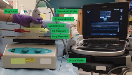 Image acquisition platform incorporating (top to bottom): ultrasound probe manually held in place and connected to the ultrasound unit, synthetic skin positioned atop the rib phantom that was held in place by the ring stand, and the lung phantom located on the bed of the orbital shaker.