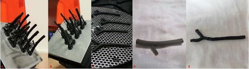 Manufacturing process of the temporal artery models at various stages. (A) Picture taken just after the printing process finished of an axillary artery model. (B) Image after washing of the axillary artery models in isopropanol. (C) Picture after hardening of temporal artery models with 405 nm LED light. (D,E) high resolution images of a temporal and axillary model respectively.