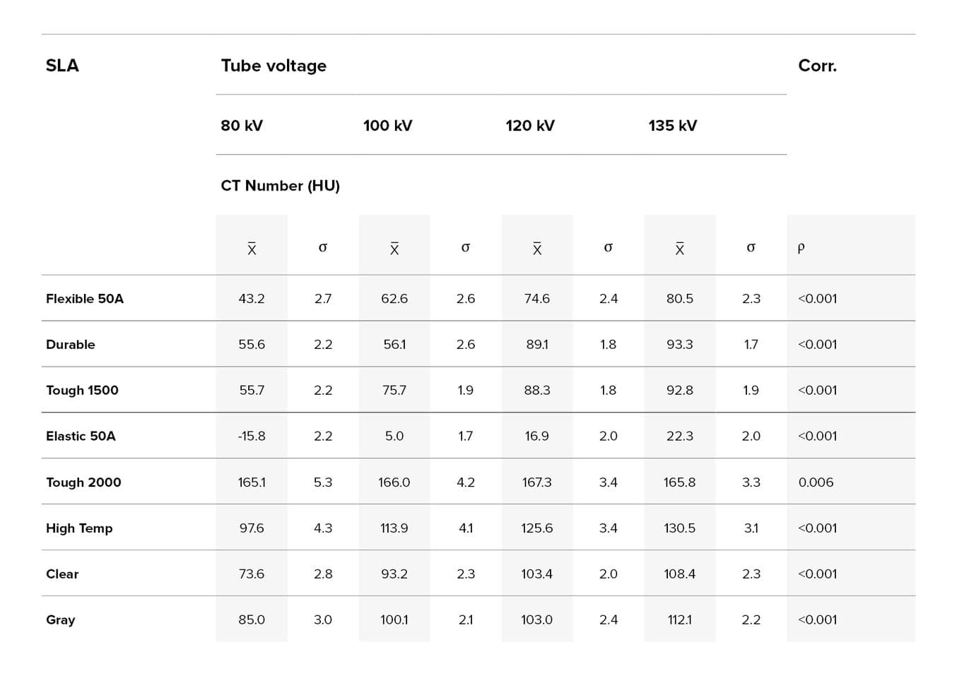 Results: “All materials correspond to a certain human tissue and they have uniformity when printed with 100% infill. CT number ranged… from −15.8 HU to 167.3 HU, for SLA materials.”