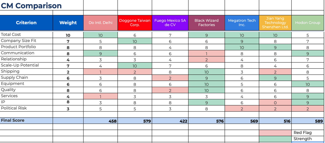 In the sheet named ‘CM Comparison’, potential manufacturing partners are ranked according to different criteria with various weights depending on their importance. This provides an overview and can help put an end to biased opinions due to overvaluing factors such as lowest cost, being the largest CM, or having the most attractive corporate culture. The process can be democratic by involving senior members of the management and the development teams to determine the selection criteria and their respective importance.