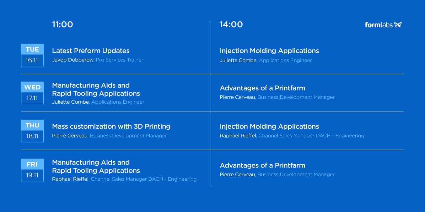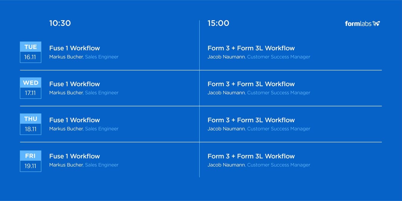 - Learn from in-booth presentations. Formlabs will present on an array of topics like advantages of a printfarm, injection molding applications, and workflows for the Fuse 1, Form 3, and Form 3L. Expand your 3D printing knowledge by attending these presentations.