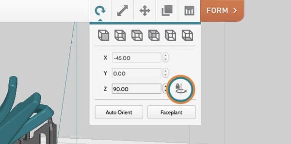 The button circled above limits rotation so that your model only spins about the z-axis. With this type of rotation, you don't need to re-generate the support structures each time you move the model. This especially helps when you’re placing multiple models on the build platform — packing is a lot less time-consuming!