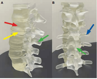 Aus dem Bericht: „A, laterale; und B, posteriore Ansicht der Lendenwirbelsäule. Die Wirbelkörper (roter Pfeil), Dornfortsätze (grüner Pfeil) und Querfortsätze (blauer Pfeil) sowie die Bandscheiben (gelber Pfeil) sind alle eindeutig dargestellt. 7–9“