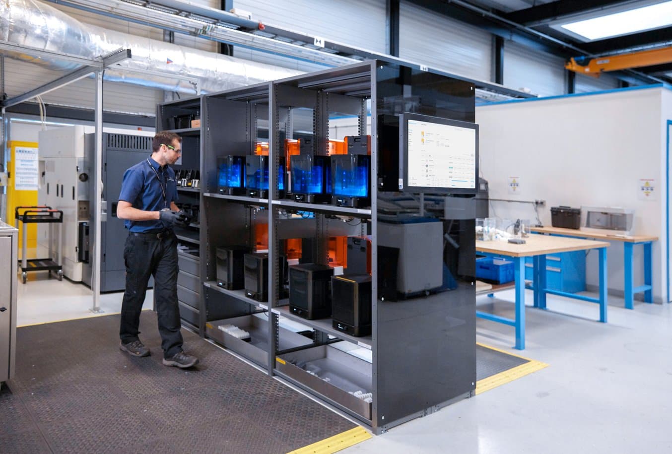 Ein einziger Techniker verwaltet den Bereich und kümmert sich um die Drucker. Der Techniker bedient die 12 Geräte über einen Touchscreen an der Seitenwand der Station, auf dem die Dashboard Software von Formlabs läuft. Sie bietet Informationen zum Druckstatus und dem Materialfüllstand. Wenn die Mitarbeiter zum Zentrum kommen, um die Geräte zu nutzen, müssen Sie einfach nur den Druckknopf drücken.