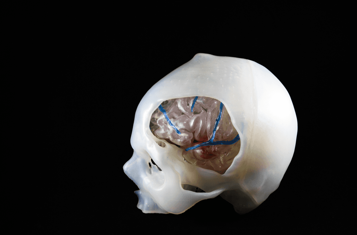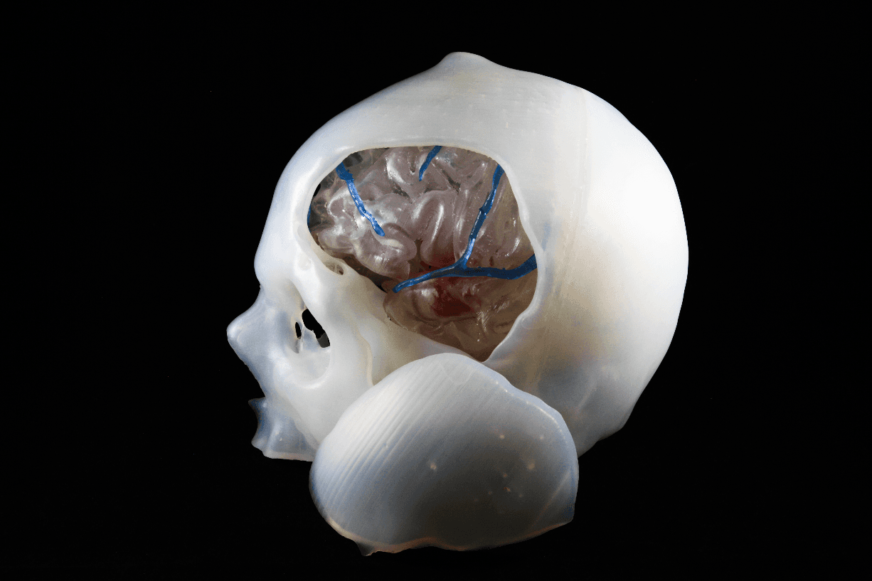 3D-gedruckter Schädel, in dem Gehirn und Arterien sichtbar sind, zur Übung von Kraniotomien.