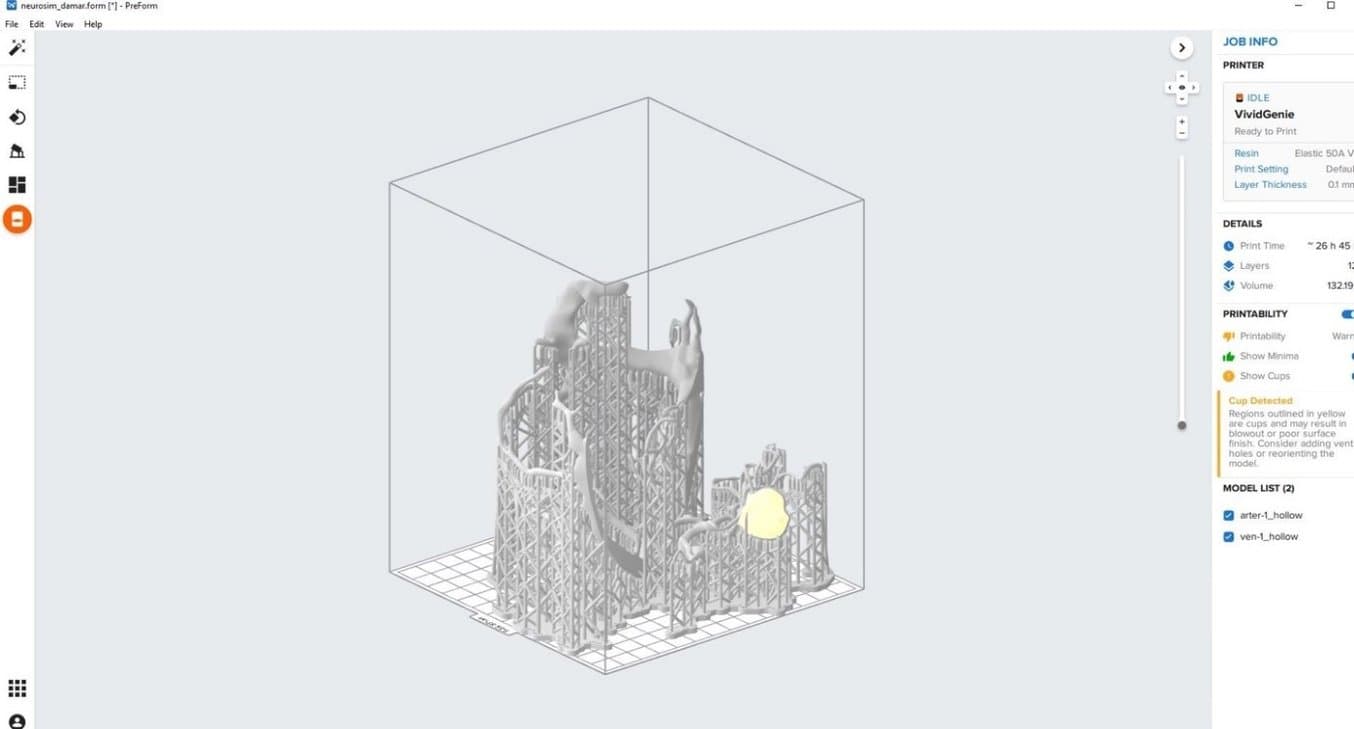 - Die Option, sowohl harte als auch weiche Materialien zu drucken. Seine Modelle umfassen nämlich sowohl Schädel als auch Arterien.