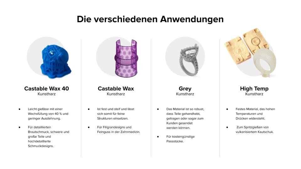 Mit diesem Material bieten wir branchenführende Gießbarkeit in Kombination mit dem intuitiven Arbeitsablauf, den Sie von Formlabs gewohnt sind. Castable Wax 40 Resin ist ein leistungsstarkes Material für Ihren Schmuckbetrieb. Es ist gleichermaßen geeignet für Anfänger und Experten, für kleine Handwerksbetriebe und die Serienfertigung. Mit Castable Wax 40 Resin möchten wir die Herstellung von 3D-gedrucktem Schmuck zugänglicher und effizienter gestalten.