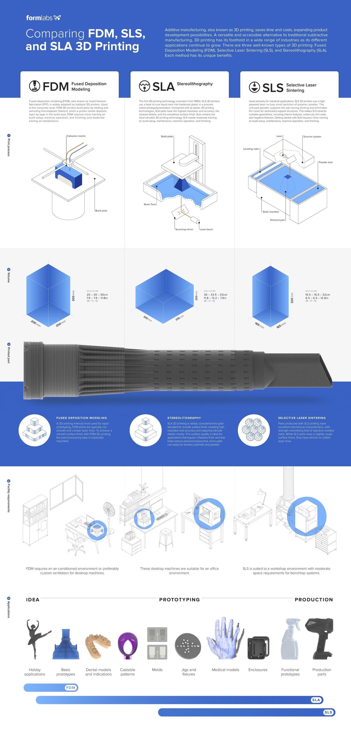 Diese Infografik zum 3D-Druck behandelt die Hauptunterschiede zwischen FDM, SLS und SLA und gibt visuelle Beispiele für den Druckvorgang jedes Verfahrens. Auch die Ergebnisse der Druckteile unterscheiden sich. Also zeigen wir, welche Ergebnisse die einzelnen 3D-Drucktechnologien hervorbringen. Außerdem ist es wichtig, Ihren Arbeitsprozess und Platzbedarf zu optimieren, wenn Sie einen 3D-Drucker bei sich aufstellen. Zu guter Letzt zeigen wir noch, für welche Anwendungsfälle sich die jeweilige 3D-Drucktechnologie am besten eignet.
