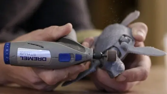 Because sometimes you want to sand fast. With interchangeable bits, rotary tools offer a variety of options for sanding and polishing parts. Drum sanding bits quickly sand down supports, while steel wire brushes smooth surface marks. Rotary tools are rough, so you will still need sandpaper for a smooth finish. There are plenty of great brands: Dremel and Craftsman are popular in the states, Proxxon in Europe. To avoid scorching your part, turn down the RPMs to the minimum (usually 500-1000) and use a light touch.