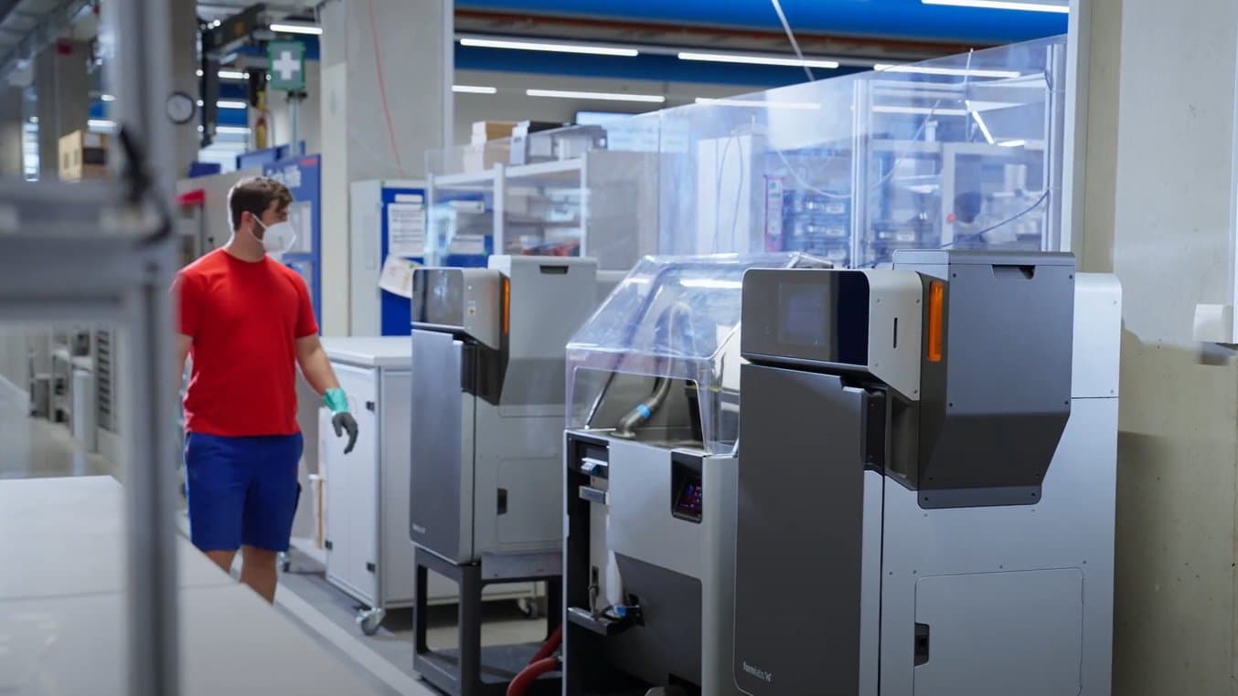 Rosenberger's tooling department uses the Fuse Sift to remove unsintered powder from the printed parts, 60% of which is recycled. Recently, the team also began using a fully automated sandblasting system — similar to the newly released, innovative Fuse Blast from Formlabs — to clean batches of prints in a closed process, further accelerating the production of large quantities.