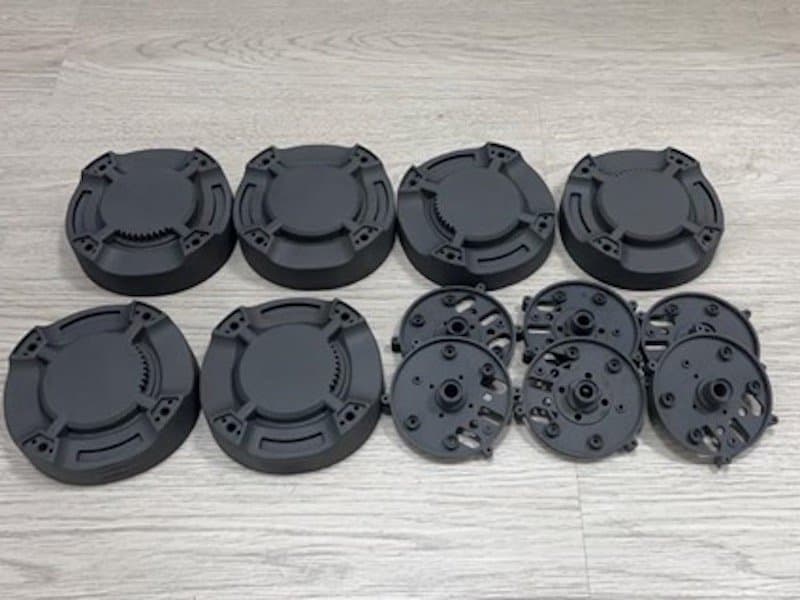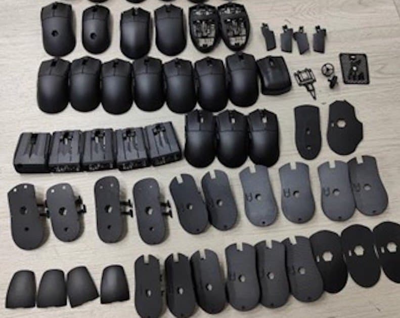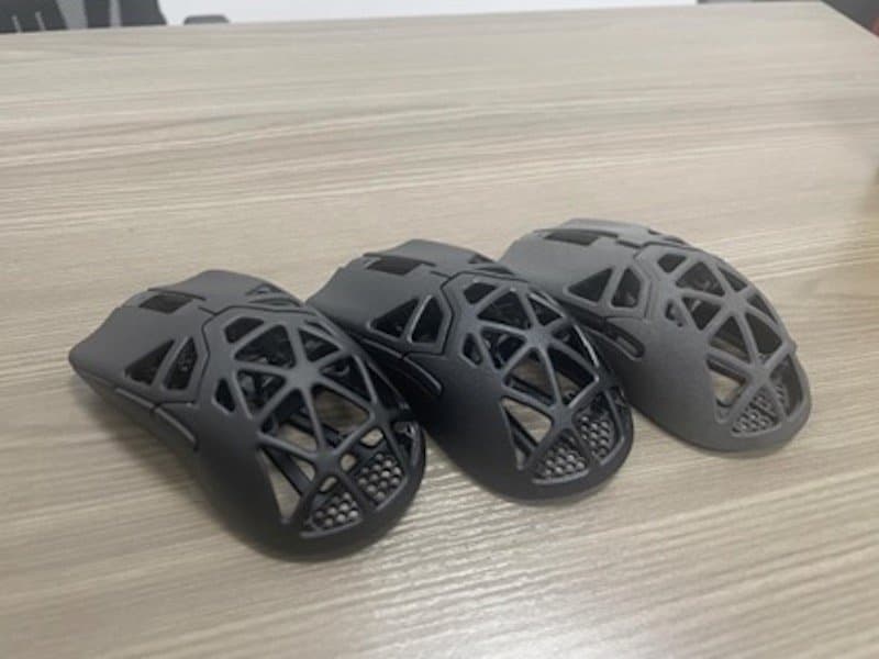SLS 3D printing enables geometries that injection molding or machining cannot accomplish — these computer mouse shells have complex designs that make them lightweight, and would be nearly impossible to machine.