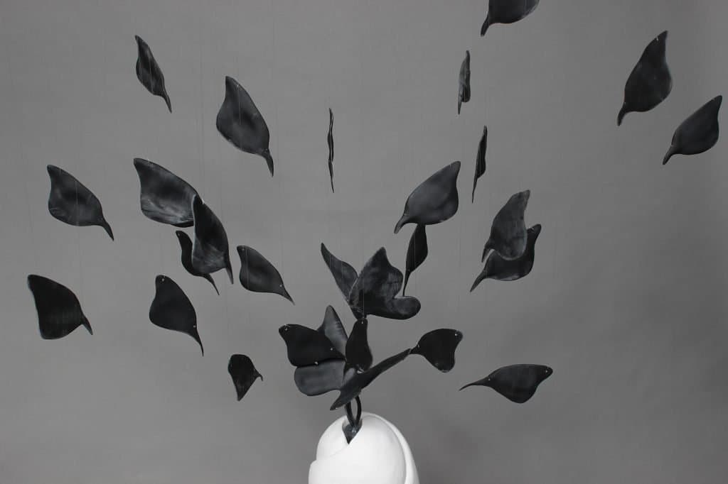 “Darkness Meets Light” is a digital sculpture installation that explores the intersection of technology with fine art, bringing together traditional and digital methodologies in one piece. The base of the sculpture, an organic form that resembles a cocoon, is carved plaster. This structure serves as the landing, birthplace, and home for the black 3D-printed butterfly wing-like forms swarming on and out of its crevice. These black forms embody a frozen moment of contrasting energies; they are both emitting out and pointing into their origin.”