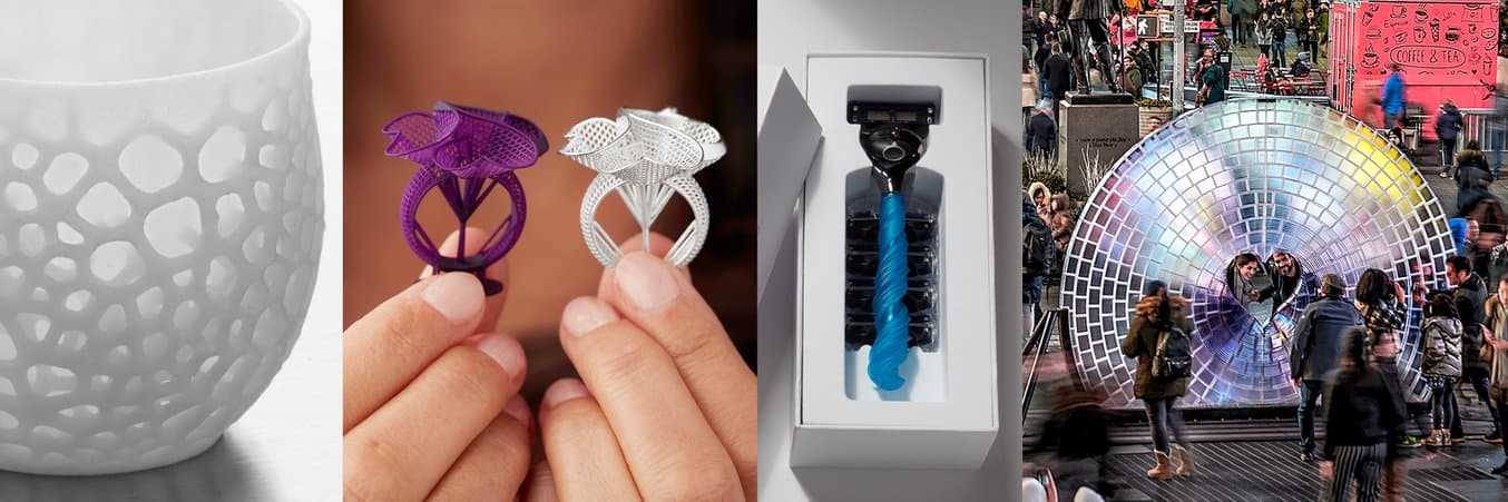 Les pièces représentées ici, de gauche à droite, ont été imprimées par : DM-Toys, Jenny Wu, Studio Waldemeyer, Sebastian Errazuriz, Arthur Mamou-Mani found et Nix Sensor Ltd.