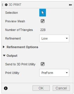 Si l'option « Send to 3D print Utility » (Envoyer à un logiciel d'impression 3D) n'est pas sélectionnée, Fusion va exporter le modèle au format STL, en fonction des options de finesse de maillage choisie. Ce fichier STL pourra ensuite être chargé dans n'importe quel logiciel de vue en coupe pour imprimante 3D.