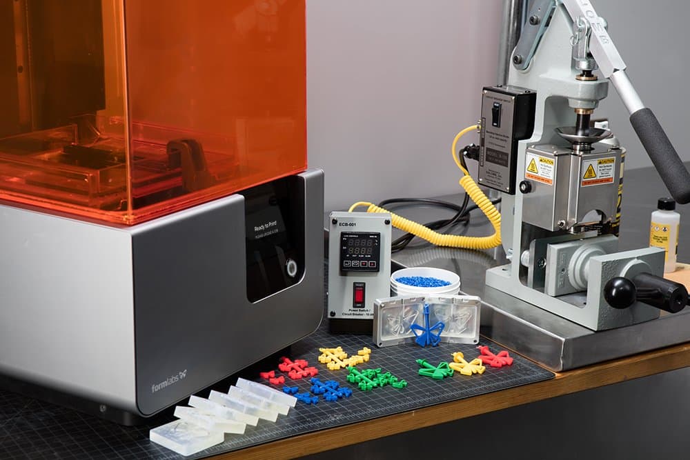 Formlabs s’est associée avec Galomb, Inc., qui fabrique des presses de moulage par injection d’atelier abordables, pour tester les moules imprimés avec la Form 2. Les moules ont produit de petites pièces en plastique identiques et n’ont présenté aucune détérioration de la surface après 25 injections de plastique polyéthylène basse densité (PEBD).
