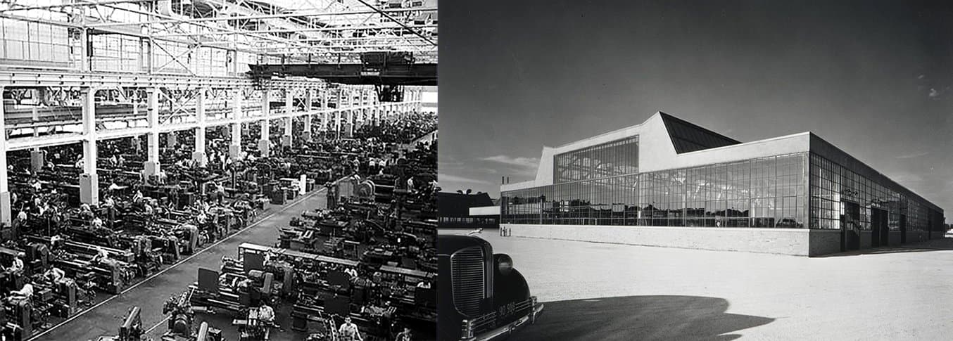 L'usine moderne est née du passage à des machines fonctionnant individuellement. Avec la disparition des arbres d'entrainement en ligne, les usines pouvaient disposer de hauts plafonds, d'installations flexibles, d'une lumière abondante et d'une meilleure sécurité des environnements de travail. La transmission de l'énergie n'étant plus mécanique, elles ont pu atteindre des dimensions que les arbres rotatifs ne permettaient pas. À gauche : Un atelier de machines dans une usine Ford de bombardiers pendant la Seconde guerre mondiale. À droite : Une usine Dodge en 1938, conçue par Albert Kahn. (Image : Bibliothèque du Congrès, Centre canadien pour l'architecture)