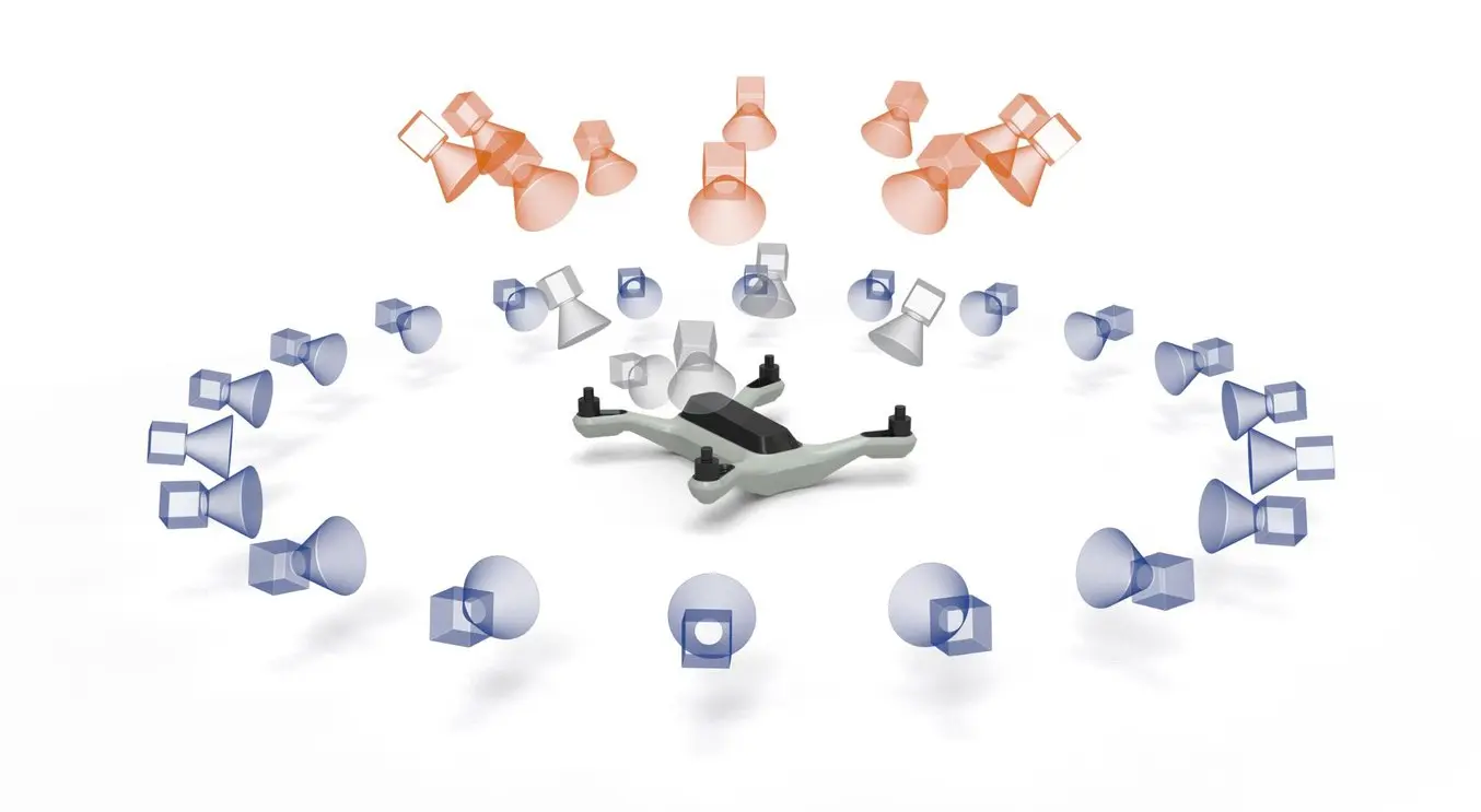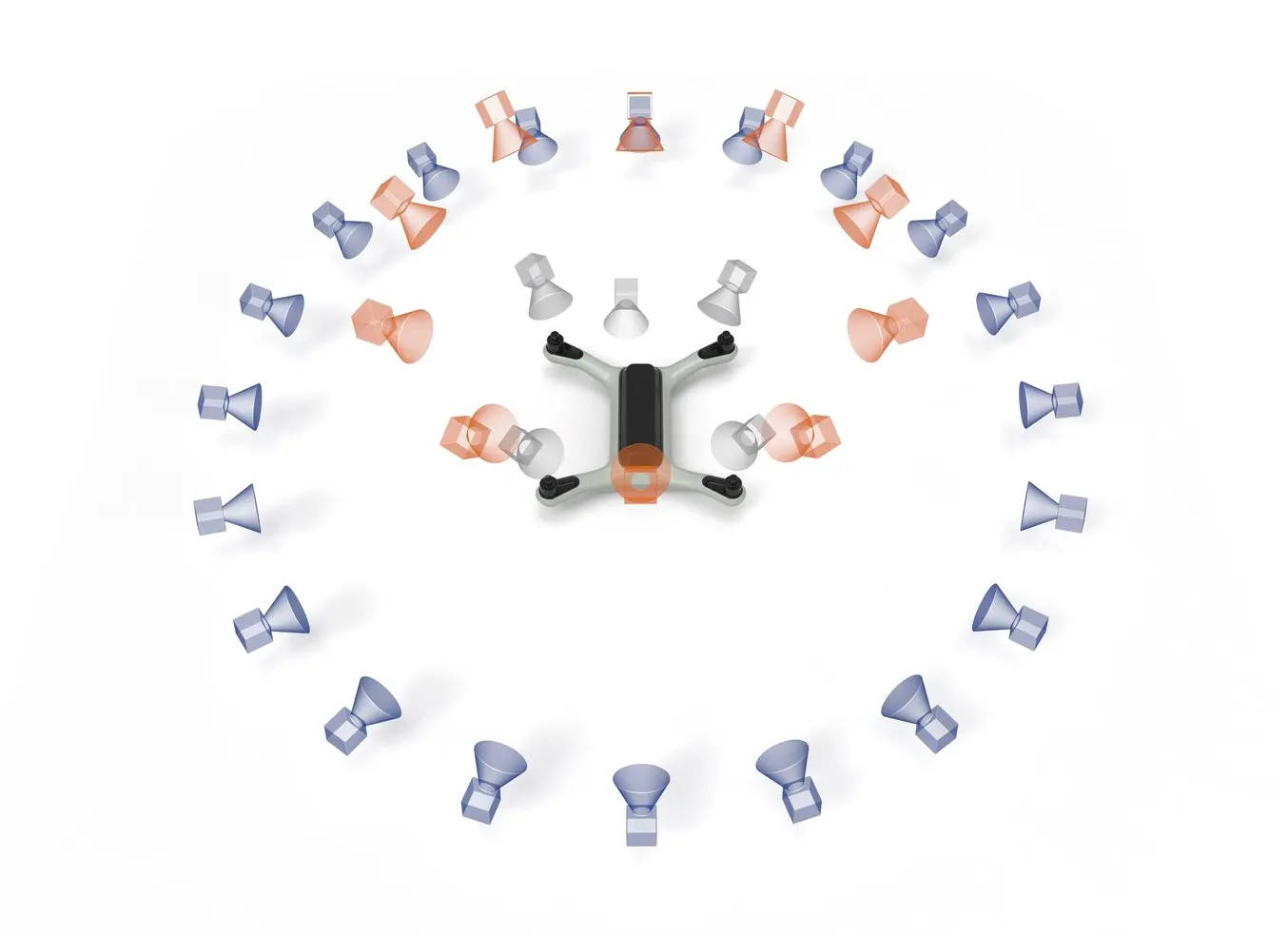 Since we are not using our drone for photogrammetry, we might as well reverse engineer it. Take photos in two bands of about 10 (blue) and 45 (orange) degrees of elevation, including some close-ups (grey).