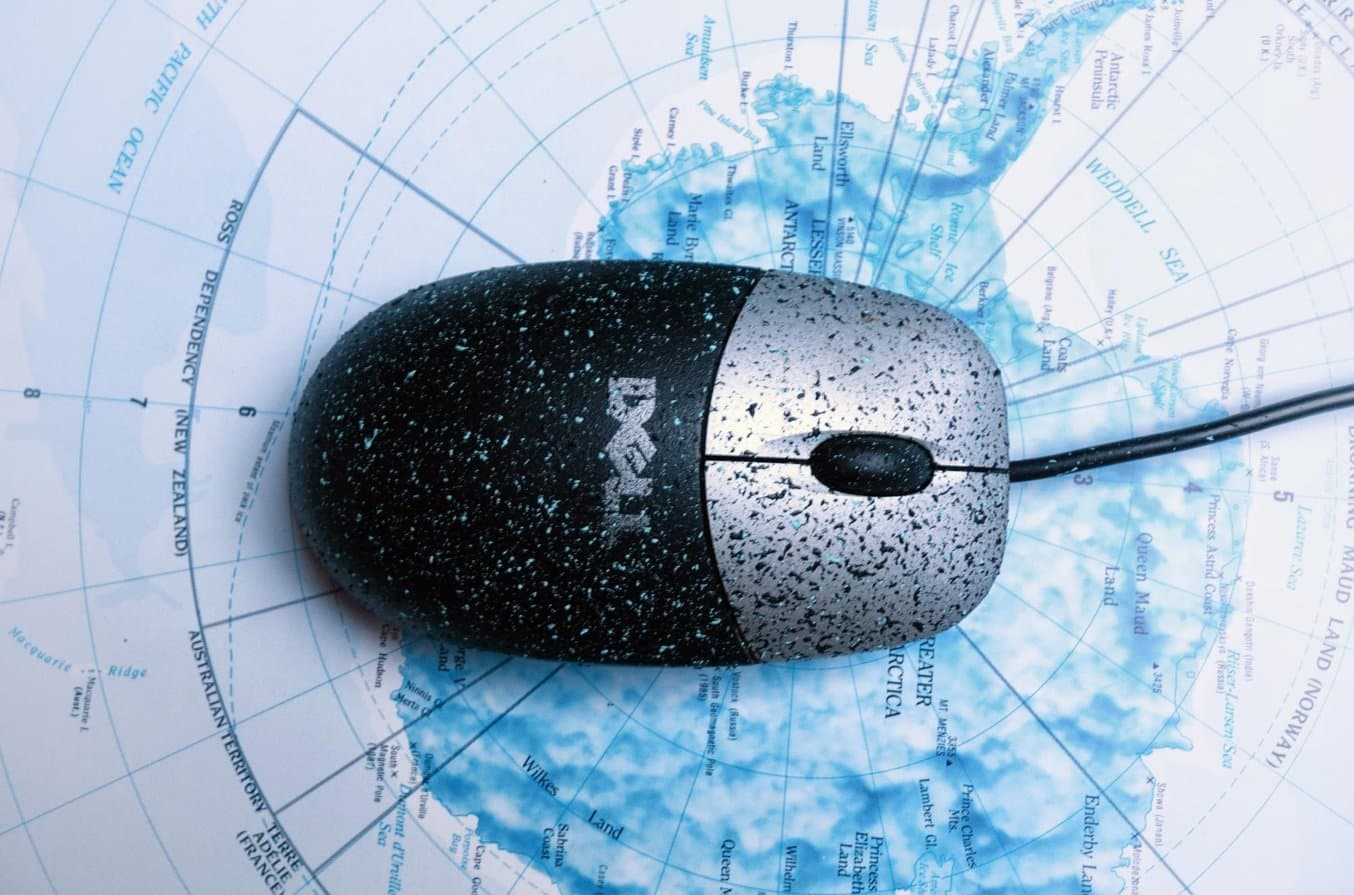 Our object of photogrammetry, a Dell M-UVDEL1 Wired Optical Mouse, prepared with marble spray paint and positioned on an underlay of the Antarctic continent.
