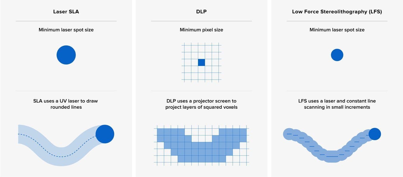 A differenza delle stampanti DLP, che hanno una matrice fissa di pixel rispetto all'area di stampa, i dispositivi basati su laser possono concentrare il fascio laser su qualsiasi coordinata XY. Ciò significa che le macchine basate su laser, grazie a un'ottica di alta qualità, possono riprodurre con maggiore precisione la superficie di una parte, anche quando la dimensione del punto laser è maggiore rispetto a quella del pixel DLP.