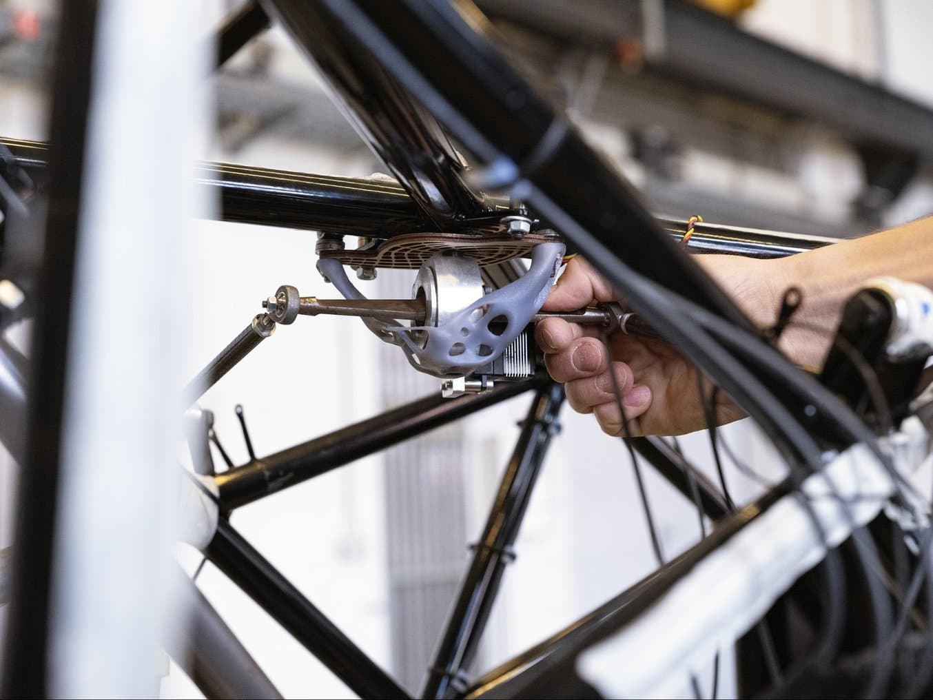 Uno stampo (immagine a sinistra, lato sinistro) utilizzato per lo stampaggio dell'involucro di un volante in fibra di carbonio (immagine a sinistra, lato destro) e un prototipo di un attacco complesso con ottimizzazione topologica (immagine a destra), entrambi stampanti con una stampante 3D SLA Form 3.