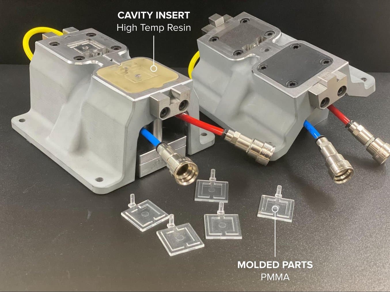 Injection molding setup for a PMMA car component, using mold insert printed in High Temp Resin.