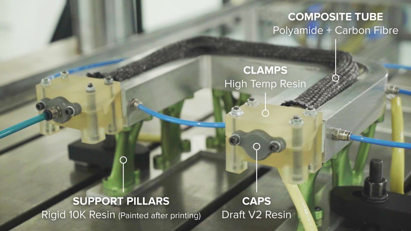 One recent example is a tool that the team developed to manufacture composite tubes. They used Rigid 10K Resin to produce the support pillars of the rig that required high stiffness, High Temp Resin to produce the clamps that needed to withstand high temperature and air pressure, and Draft Resin to quickly produce end caps for the tool.