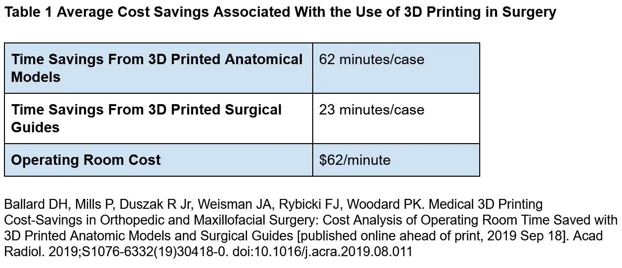 In particular, tracking surgical outcomes and cost avoidance can be a strategy for securing initial funding, as well as sustaining institutional support year-over-year. In the peer-reviewed literature, researchers have shown that the use of 3D printed anatomical models and surgical guides significantly reduce operating time, resulting in the average cost savings highlighted in the table below.