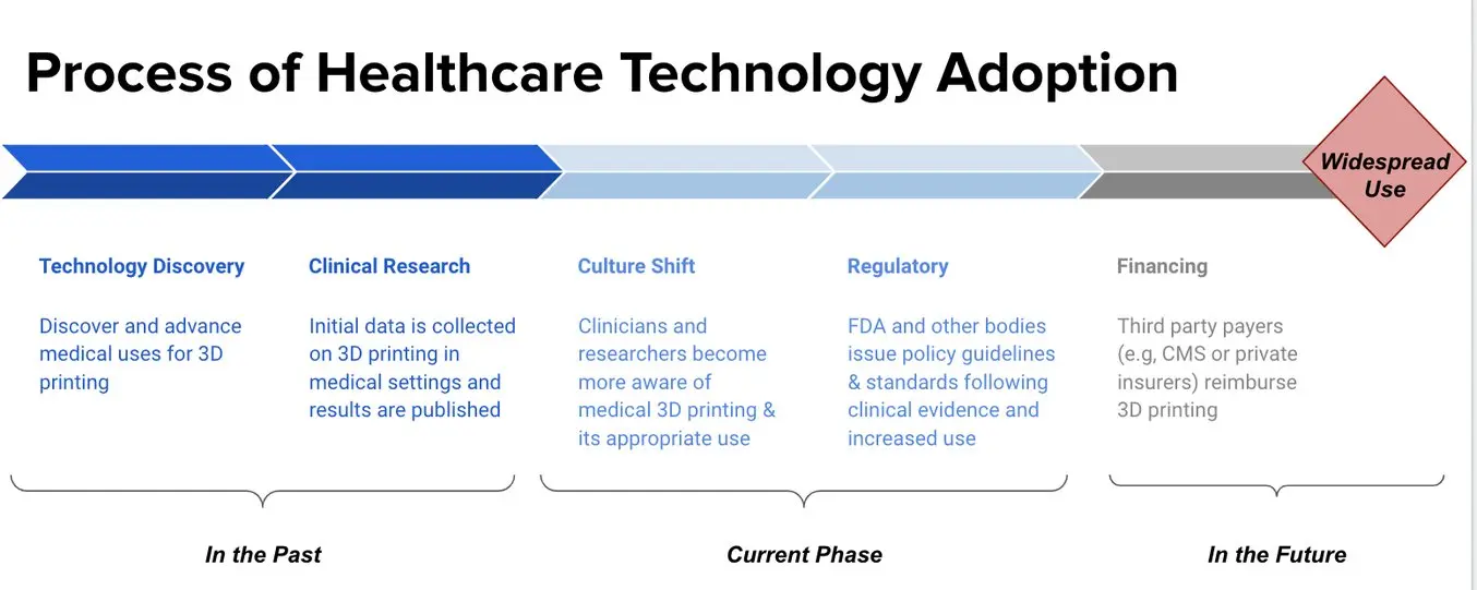 For medical technologies like 3D printing, broad third-party reimbursement often follows a lengthy process, which is highlighted in the graphic below. After a technology is introduced, innovative adopters begin to conduct and publish clinical research. As wider adoption and cultural acceptance grows, regulators such as Food and Drug Administration and others solicit input and offer guidance.