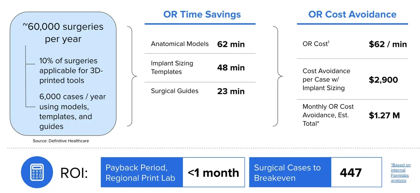 Compared to other manufacturers, Formlabs offers a low-cost, high-quality solution, making clinical and cost savings analyses even more compelling. To highlight the cost avoidance associated with Formlabs 3D printing, our team built an ROI calculator that enables health systems to analyze the payback period associated with a Formlabs printer purchase based on surgical cost avoidance. Below, we have illustrated the use of the calculator for a large, regional health system that conducts 60,000 surgeries a year across all of its locations.