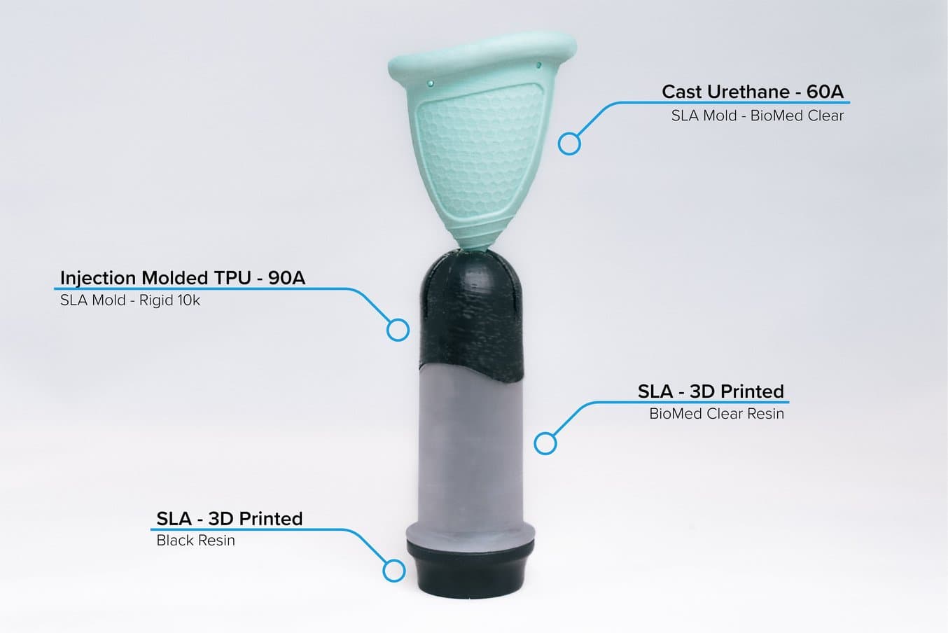 Glassboard knew this type of product - a flexible consumer product used on the human body - would require extensive prototypes and testing. Chapman turned to one of his most reliable teammates - his two Formlabs SLA 3D printers - and started printing in Elastic 50A Resin and Flexible 80A Resin to simulate the cup.