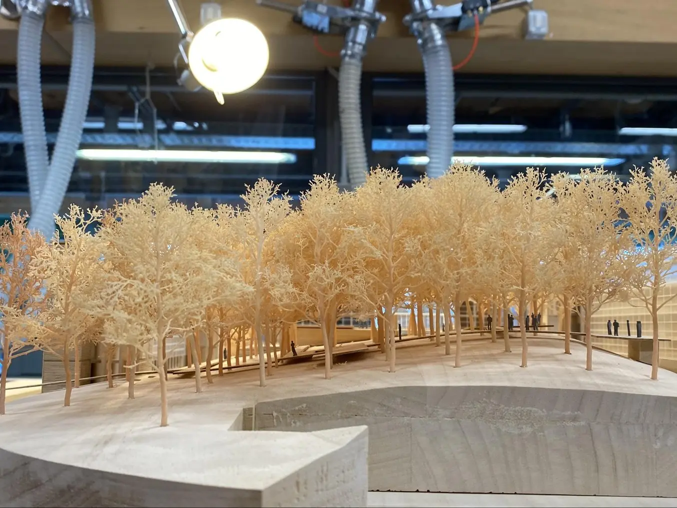 The model builders combine different technologies to create the scale models. Intricate parts like the trees on this model were 3D printed on a Formlabs printer, while other parts are CNC milled, laser-cut, or handmade.