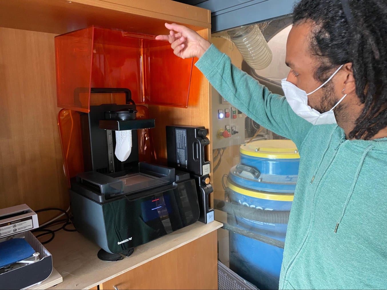 “Six years ago, we started with a powder-based machine [that uses binder jetting technology]. It was not very useful because it was very sensitive to the humidity and the precision was not what we needed. So, we moved to the Form 2, [which uses stereolithography (SLA) 3D printing technology]. Then, we added a 3D Systems [large-format material jetting printer] that prints with the resin. And we also have a small FDM 3D printer that works with PLA and ABS,” said Mr. Terranova.